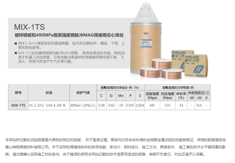 MIX-1TS 鍍鋅鋼板和490MPa級高強度鋼脈沖MAG焊接用實心焊絲
