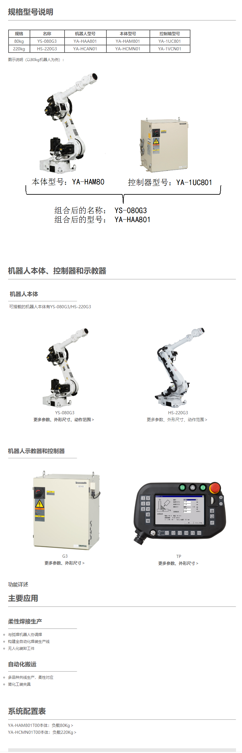 YS和HS系列機(jī)器人,是大型機(jī)器人,目前在售的產(chǎn)品具體名稱為YS-080G3機(jī)器人和HS-220G3機(jī)器人,其可搬重量分別為80kg和220kg,這2種機(jī)器人都使用G3控制器,一般用于搬運(yùn)。